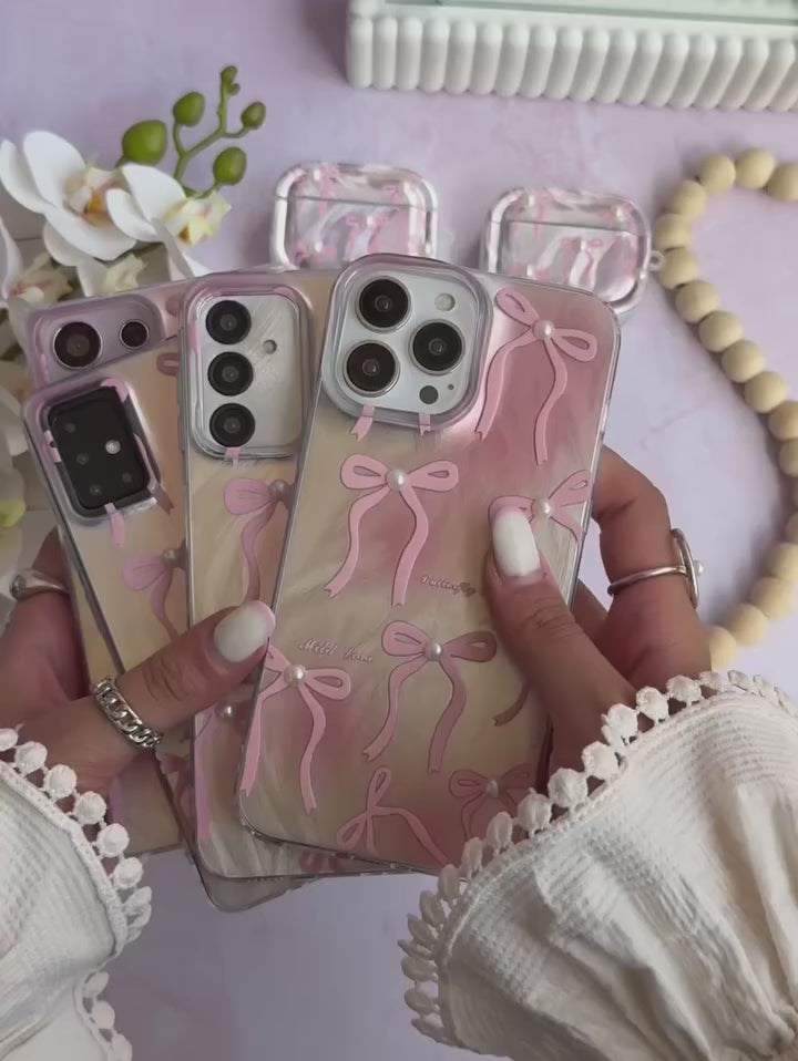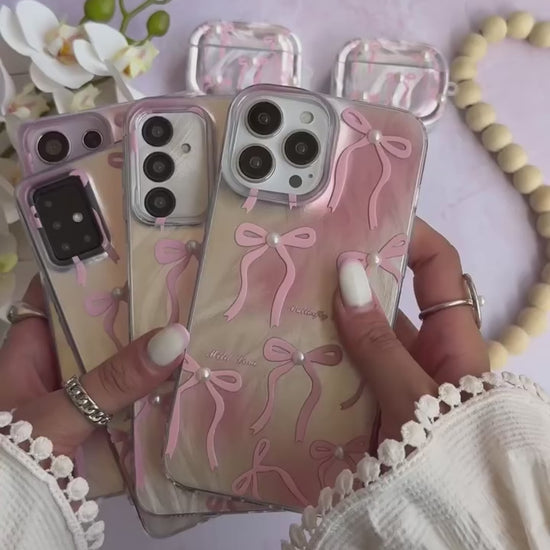 This charming case features a dreamy swirl-textured background decorated with soft pink 3D ribbon bows, each accented with a delicate pearl for a touch of sophistication. The clear glossy base enhances your phone’s natural color while adding a feminine, graceful vibe.
